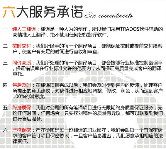 從客戶需求出發(fā),提供人性化服務(wù),免費(fèi)修改譯文,對譯文終身負(fù)責(zé),提供滿意的售后服務(wù)。翻譯歸根到底是基于行業(yè)知識(shí)的技術(shù)勞動(dòng),有時(shí)根據(jù)客戶需要和實(shí)際場景譯文會(huì)有補(bǔ)充和修改,長期愉快的合作需要相互理解、溝通和支持。